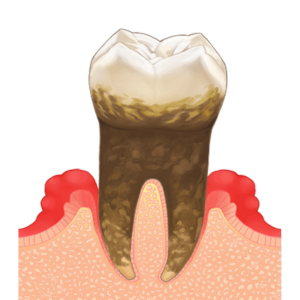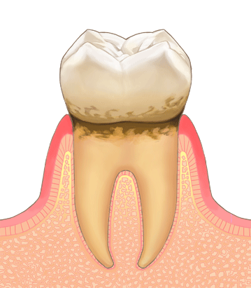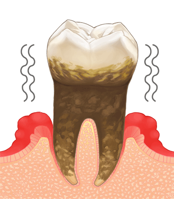 最終段階の重度歯周炎では、歯槽骨の大部分が失われ歯の動揺や脱落のリスクが非常に高くなります。歯周ポケットから膿が出る、強い痛みが生じるなどの症状が起こり、歯を抜かなければならないことも。